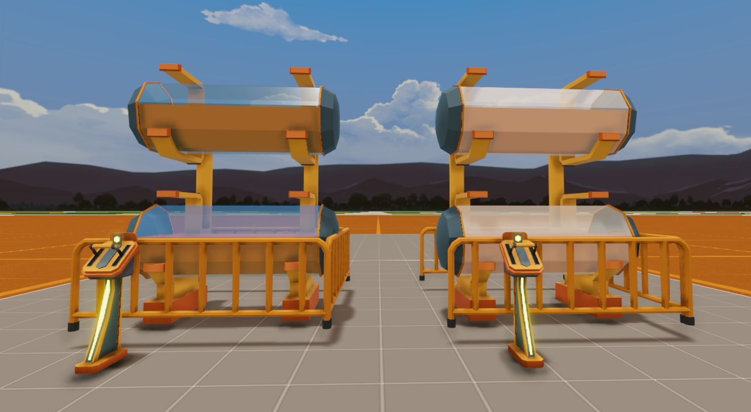 The image below shows two identical models, created with the same colors and textures. The model on the left uses all PBR materials, some of them include metalness, transparency, and emissiveness. The model on the right uses all standard materials, some including transparency and emissiveness.