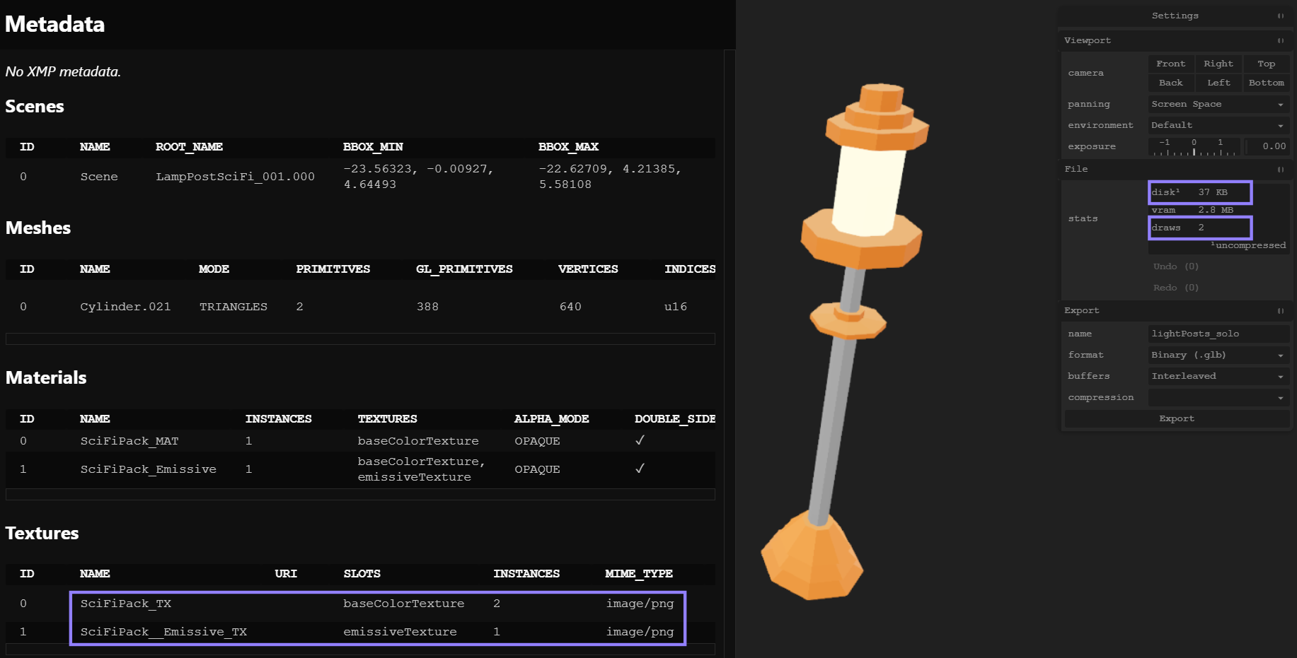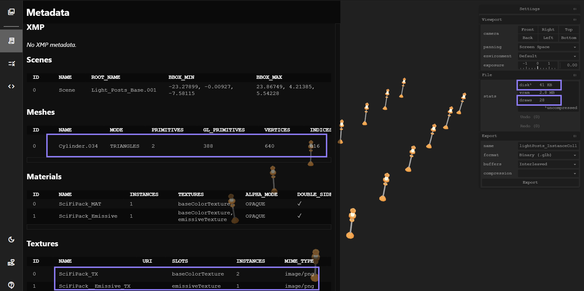 When we export these models, we will still have the same number of draw calls (28). However, note that we now have only one mesh, which significantly reduces disk usage (41 kb).