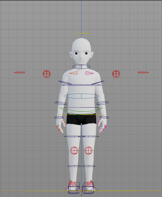 Controls are non-deforming bones that drive the base skeleton. They have different colors depending on their category: