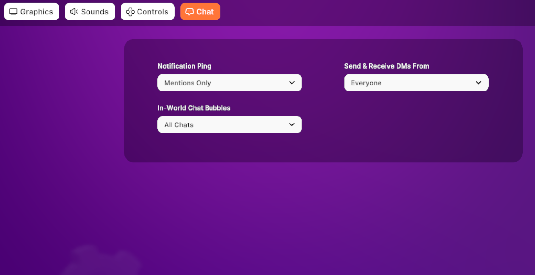 From the main settings, you can modify notification and chat bubble preferences for all your chats simultaneously as well as your DM permissions. See the Chat section for a full breakdown.