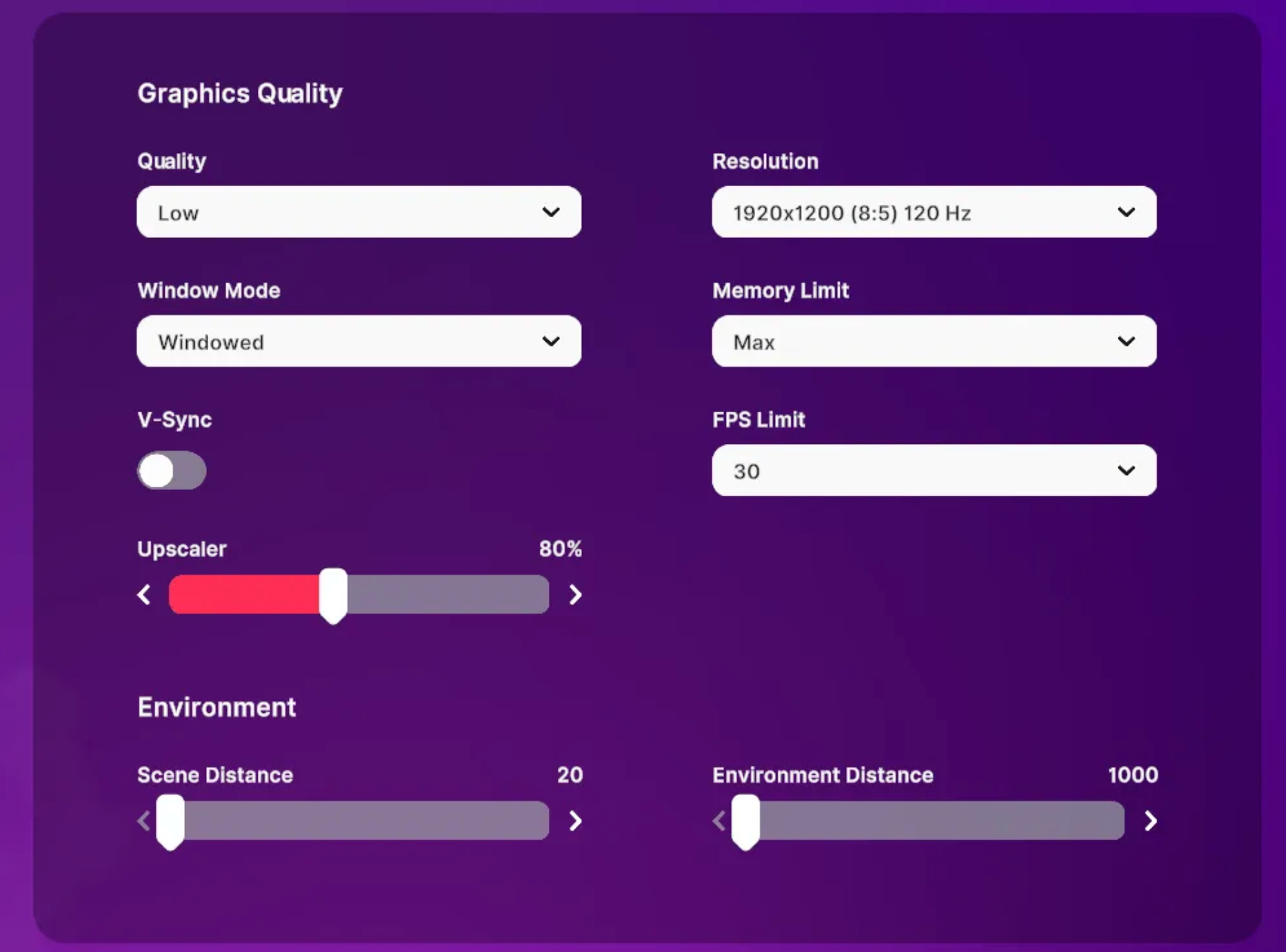 If your computer doesn’t meet all of Decentraland’s minimum hardware requirements, you can try to optimize your experience by lowering your graphic settings in-world. Here are the settings for best performance: